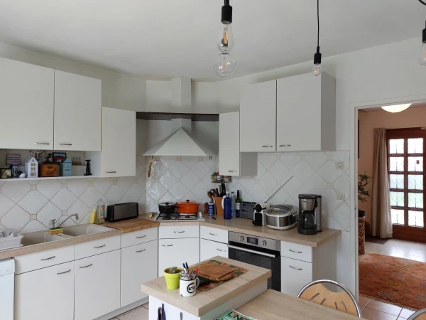 La cuisine est actuellement séparée de la salle à manger, mais il est possible d'ouvrir l'espace.
